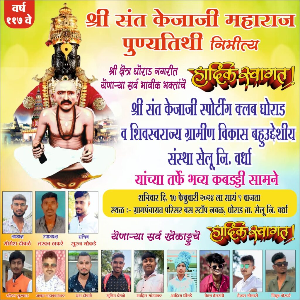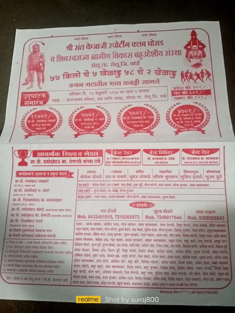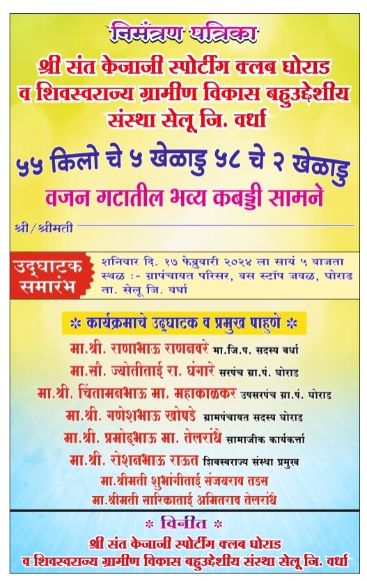 श्री संत केजाजी स्पोर्टीग क्लब घोराड व शिवस्वराज्य ग्रामीण विकास बहुउद्देशीय संस्था सेलू जि. वर्धा तर्फे -५५ किलो चे ५ खेळाडु ५८ चे २ खेळाडू वजन गटातील भव्य कबड्डी सामने
