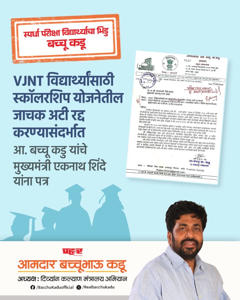 महाज्योती संयुक्त गट ब, गट क यांचा प्रशिक्षण कार्यक्रम कालावधी 6 महिन्यावरुन 11 महिने करण्यासंदर्भातआ. बच्चू कडू यांचे मुख्यमंत्री एकनाथ शिंदे यांना पत्र