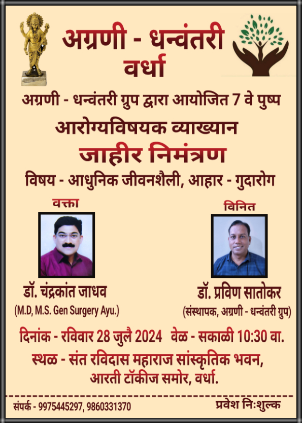 अग्रणी – धन्वंतरी ग्रूप, सालोड, वर्धा. द्वारा रविवार 28 जुलै 2024 को डॉ. चंद्रकांत जाधव MD .MS. आधुनिक जीवनशैली, आहार – गुदा रोग. (Modern Lifestyle, Diet – Rectal Disease)इस विषय पर व्याख्यान आयोजित किया गया है|कृपया आपकी उपस्थिती प्रार्थनीय रहेगी|समय सुबह 10.30 बजेस्थान- श्री संत रविदास महाराज, सांस्कृतिक भवन, वर्धा. (आरती टॉकीज के सामने) नोट -सभी सदस्य आपके साथ एक पारिवारिक सदस्य या मित्र कार्यक्रम को साथ में ला सकते है आपके आने की सूचना आपको शुक्रवार शाम तक देनी है|कार्यक्रम निशुल्क है|