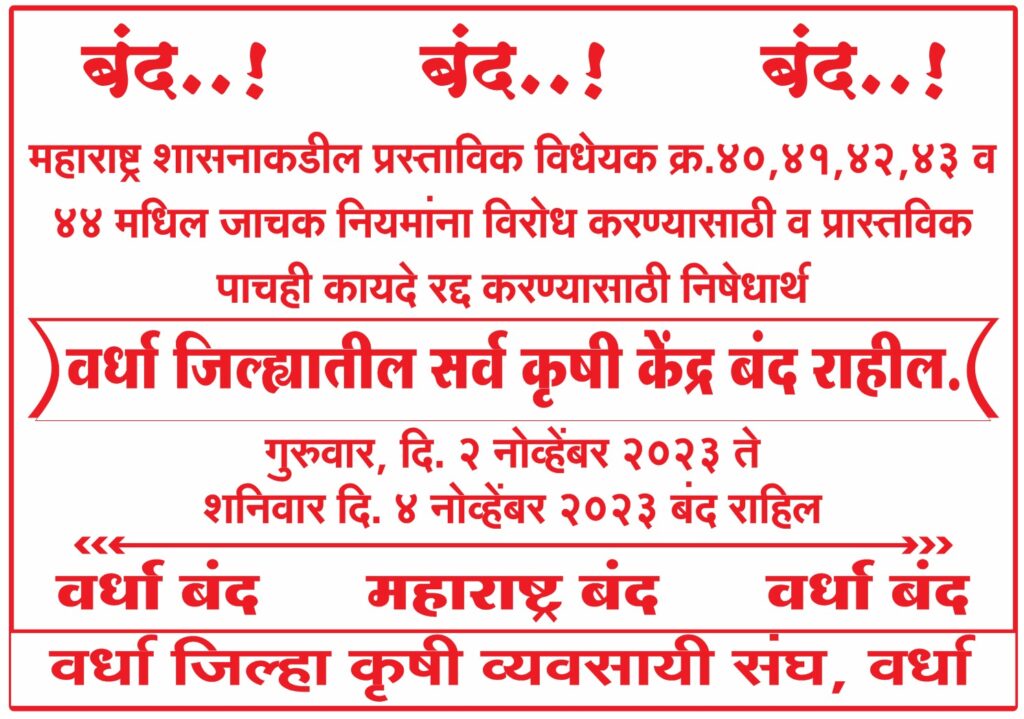 सध्या पेरणीचा हंगाम सुरू झाला आहे. ऐन पेरणीच्या हंगामातच येणारे चार दिवस कृषी केंद्र बंद राहणार आहे. महाराष्ट्र शासनाच्या प्रस्तावित पाच कायद्या विरोधात महाराष्ट्रासह जिल्हा कृषी व्यावसायिक यांनी २ ते ४ नोव्हेंबर पर्यंत बंद पुकारला असला तरी सेलू तालुक्यात हा बंद ५ नोव्हेंबर पर्यंत राहणार आहे.